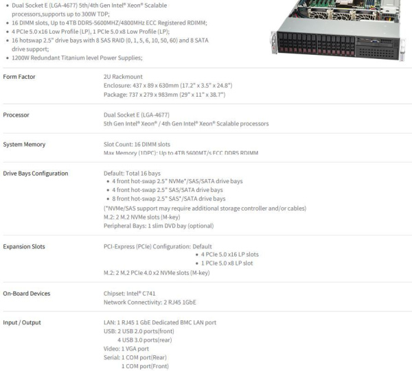 Платформа Supermicro SuperServer SYS-221P-C9R 2xLGA4677, 4xDDR5, 16x2.5", 2x1GbLan, 2x1200W RAILS глубина 630 mm 2U-1шт